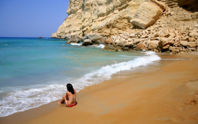 Hidden behind a rocky hill south of the village of Matala, Red Beach is a secluded spot that has long attracted naturists and free spirits.