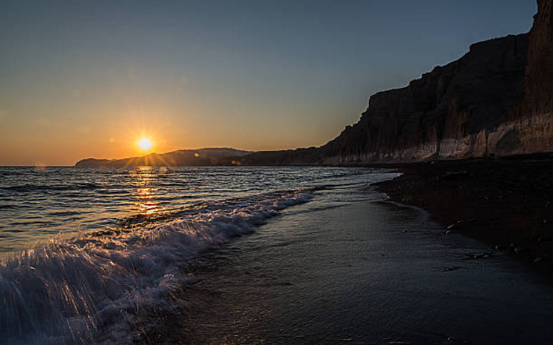 Vlychada Beach, on the southern coast, is famous for its lunar-like white cliffs carved by centuries of wind and sea. In the evening, the fading light paints these cliffs in golden hues, while the sun sets over the open sea. It’s quieter than the popular Kamari or Perissa beaches, making it ideal for a romantic walk or a private moment. Bring a blanket, sit in the sand, and watch as the waves reflect the changing sky.