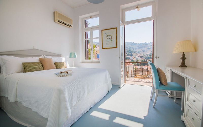 Its infinity pool overlooks the colorful harbor below — one of the most breathtaking views in the Dodecanese. Rooms combine exposed stone walls with elegant modern touches. The atmosphere feels intimate, artistic, and slightly bohemian — perfectly suited to Symi’s character.