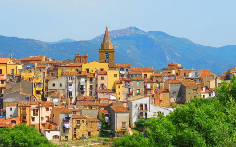 At its center stands a medieval castle, and the streets are lined with old stone buildings and bakeries selling traditional Sicilian sweets. The surrounding countryside adds to its charm, with views stretching toward the sea in the distance.
