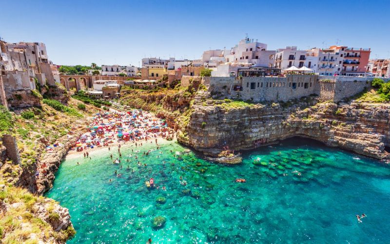 Balconies hang precariously over deep blue water, while the famous Lama Monachile beach sits dramatically between rock walls below the town. Narrow lanes, white façades, and poetic sea views make Polignano one of southern Italy’s most photogenic villages.