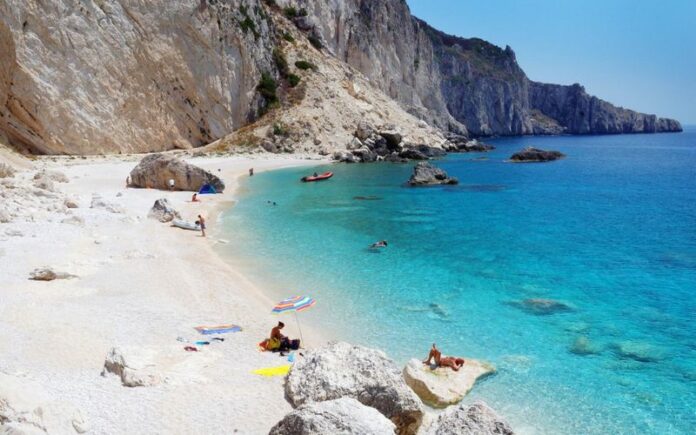 The island is lush, quiet, and full of natural beauty. Small villages dot the hillsides, and the coastline is lined with caves and turquoise beaches. Aspri Ammos, a white-pebble beach surrounded by cliffs, is one of its highlights.