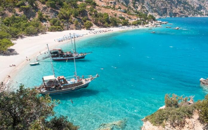 Often described as one of the most stunning beaches in Greece, Apella Beach in Karpathos feels wonderfully remote despite its growing reputation. Surrounded by steep green mountains and dense pine forests, this cove opens onto dazzling turquoise water that looks almost unreal in the sunlight.